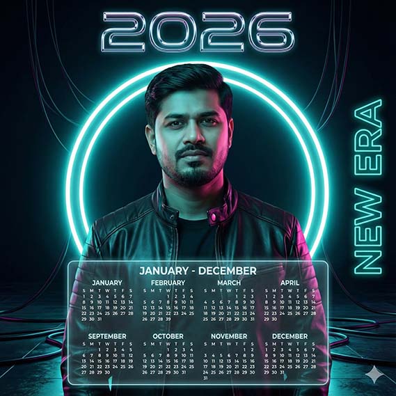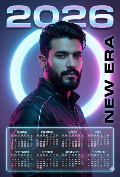 “Futuristic neon portrait poster of a confident stylish man in a black leather jacket, standing in front of a glowing circular neon light. Vibrant cyberpunk teal and pink lighting illuminating the face, sharp jawline, well-groomed beard, cinematic atmosphere. Sleek typography displaying the year 2026 at the top in glossy chrome neon-style font, and a transparent glowing holographic calendar layout at the bottom. Text ‘NEW ERA’ vertically aligned on the right side. Ultra-realistic portrait photography, high contrast, cyberpunk studio background, 8K resolution, glossy and futuristic finish, dramatic lighting reflections, sci-fi poster style.”covering the 12 months of 2026, from January to December. Keep the face as it is in the uploaded photo.