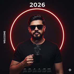 “Ultra-realistic portrait of a modern stylish man wearing black sunglasses, holding a steaming black coffee mug, dressed in a black t-shirt, sharp jawline and detailed beard texture. The background is dark studio lighting with a glowing neon red halo circle perfectly behind the head, soft smoke rising from the cup, futuristic minimal poster theme, year ‘2026’ displayed at the top with clean bold typography, vertical text ‘WELCOME’ on the left side, calendar layout at the bottom in minimal white type. High contrast lighting, crisp details, cinematic look, glossy finish, 8K resolution, photorealistic face and hands, soft shadows, professional studio photography style. covering the 12 months of 2026, from January to December. Keep the face as it is in the uploaded photo.