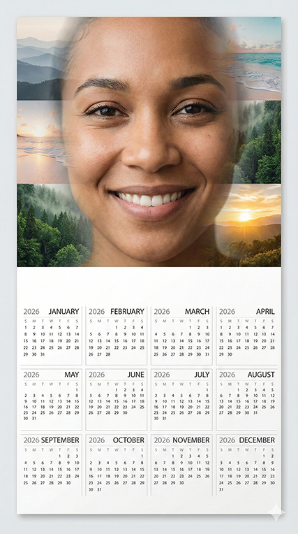 “Create a 2026 full-year photo calendar using the uploaded photo’s face exactly as it is. Place the portrait at the top and keep facial features unmodified. Add a variety of scenic nature backgrounds such as mountains, beaches, forests, and sunrise skies blended softly behind the photo. Below the portrait, include a clean 12-month 2026 calendar with: January, February, March, April, May, June, July, August, September, October, November, December. Use high-quality print design and modern fonts.”