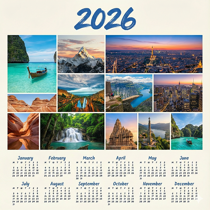 “2026 travel calendar design, breathtaking landscapes, ocean views, snow peaks, city skylines, ultra-realistic photography, professional color grading, printed calendar layout.””Soft paper texture background in ivory/white colors. '2026' written in bold artistic blue brush font above the portrait. Below, a clean and beautiful full-year calendar layout in handwritten-style blue text. Highly detailed facial sketch, sharp line art, premium illustration quality, artistic splash effects, professional print-quality design, and 8K resolution. Use my uploaded photo.