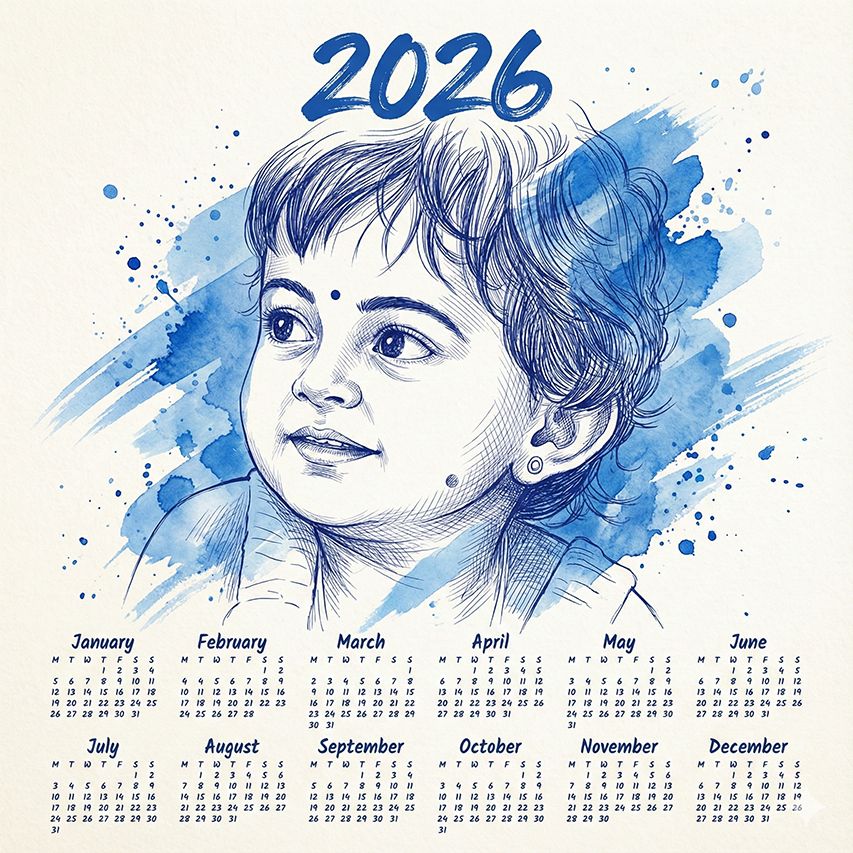 Photo drawn in blue pen sketch style, where the person in the photo should be the same as the photo given, without changing the face. Smooth ink strokes behind the portrait, splatter effects, and dynamic watercolor brush elements. Soft paper texture background in ivory/white colors. '2026' written in bold artistic blue brush font above the portrait. Below, a clean and beautiful full-year calendar layout in handwritten-style blue text. Highly detailed facial sketch, sharp line art, premium illustration quality, artistic splash effects, professional print-quality design, and 8K resolution. Use my uploaded photo.