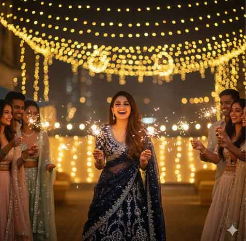 "Create a night-time rooftop Diwali party scene, use the face from the above image. She is laughing with friends while holding sparklers, wearing a navy blue sequined lehenga with silver embroidery. Her hair is open and flowing, and fairy lights are strung all around the rooftop. The camera captures candid joy, warm tones, and a Pinterest-style bokeh background."