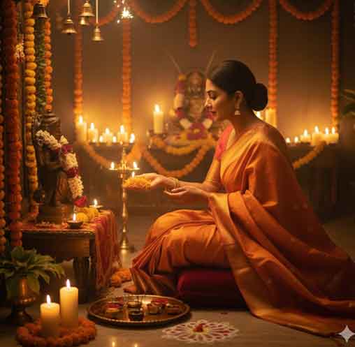 "Set in a cozy home temple space decorated for Diwali, the woman (use face provided) is seen offering flowers during a Lakshmi puja. She's in a traditional orange silk saree with zari border, minimal makeup, and a serene expression. The lighting is from oil lamps and candles only, giving it a warm, intimate aesthetic with deep shadows."
