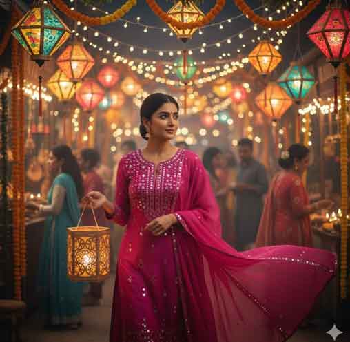 "Create a dreamy marketplace scene during Diwali night. Use the face of the same girl. She is walking through a bazaar full of colorful lanterns and marigold garlands. Wearing a magenta kurta with mirror work and a chiffon dupatta flowing behind, she's glancing sideways while holding a paper lantern. The setting is vibrant, with overhead lights and blurred crowds."