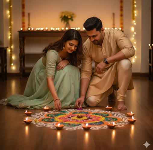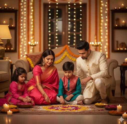 - “A family celebrating Diwali with traditional attire, golden lights, and floral rangoli.”