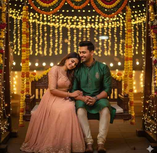 "Depict a romantic moment of a couple sitting on a swing covered in flowers and fairy lights. Use the face in the image provided here. The woman rests her head on the man’s shoulder; she wears a peach anarkali and he’s in a forest green kurta. The background is filled with soft candlelight, creating a cozy Diwali ambiance."