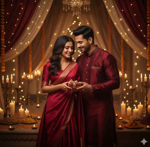 "Visualize a couple exchanging Diwali gifts inside a softly lit room. Use the face in the image provided here. The woman is surprised and smiling, holding a small box; the man is in a maroon kurta and leans toward her playfully. The room is filled with candles, sweets, and draped fabrics for a rich Pinterest aesthetic."